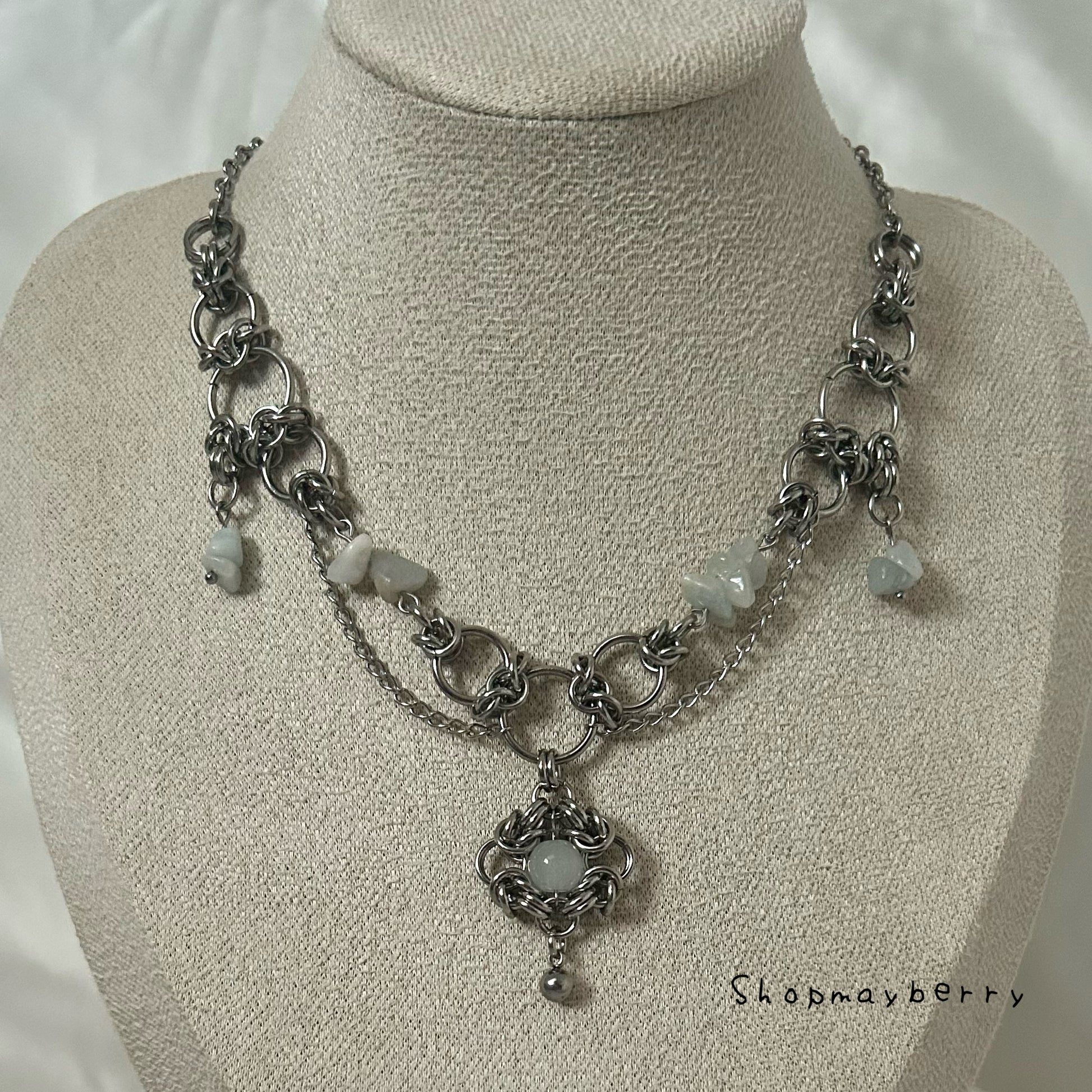 Chainmail necklace handmade with stainless steel rings and grey stones